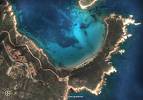 L’azzurro intenso del mare diventa verde smeraldo quando si avvicina alla terra, il bianco luminoso delle lingue di spiaggia disegna il bordo frastagliato della costa e contorna il verde acuto in cui l’isola è sommersa.